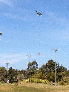 As we turned into the golf course we saw that the Bush Fire Brigade had set up a base in a reserve for refuelling the helicopters. There were three helicopters coming and going all afternoon, 2 of them had water buckets attached to them.