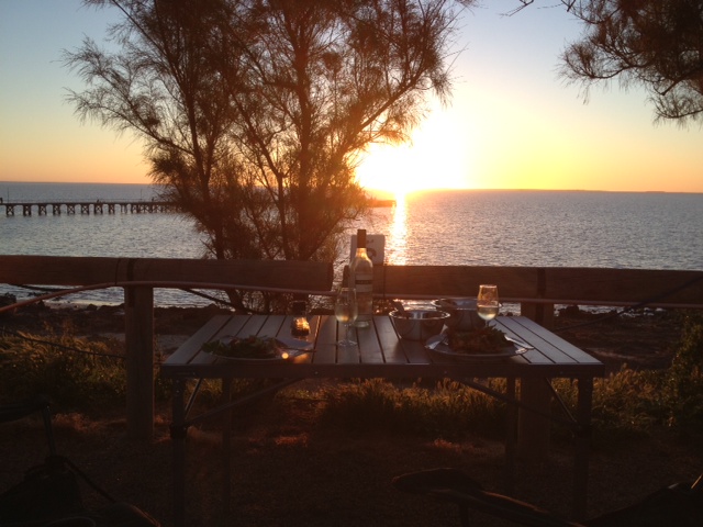 We marinated the squid in some Chilli Jam and cooked it up in the camp kitchen (to save stinking out the van). Deb made a delicious salad, and we sat down for tea and watched the sun set over the gulf while we ate and washed it down with a nice wine.