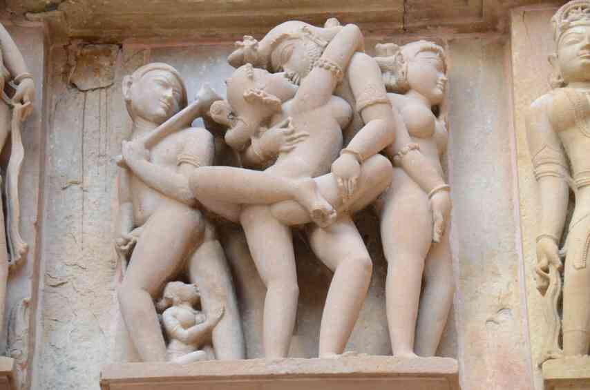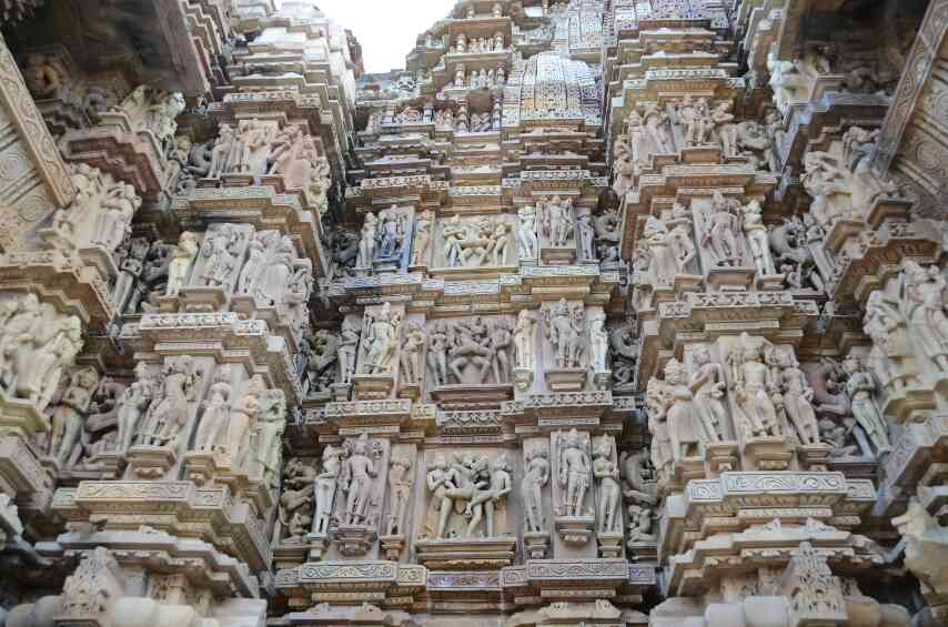 After a quick settle in and lunch we were picked up at 3pm for our afternoons tour of the UNESCO World Heritage listed site of Hindu Temples. These historic buildings are famed for their intricate detail, delicate sensuality and forthright eroticism. The temples were built over a period of about 150 years starting from around the 10th century AD by the Chandella dynasty. There were originally 85 Temples, but now there are only 25 left. The carved stone of the temples represents all facits of life at the time. The carvings depict the importance of Hinduism in the life of the ruling classes and the classes below them. From Hindu Gods to Armies and, what were described by the young English Engineer TS Ward who discovered them in 1838, under a jungle, as, “most beautifully and exquisitly carved” but that some images were “extremely indecent and offensive”. There are many carvings depicting all forms of sex from masturbation through oral to homosexuality and beastiality. Not really the proper thing for a Victorian English Officer!