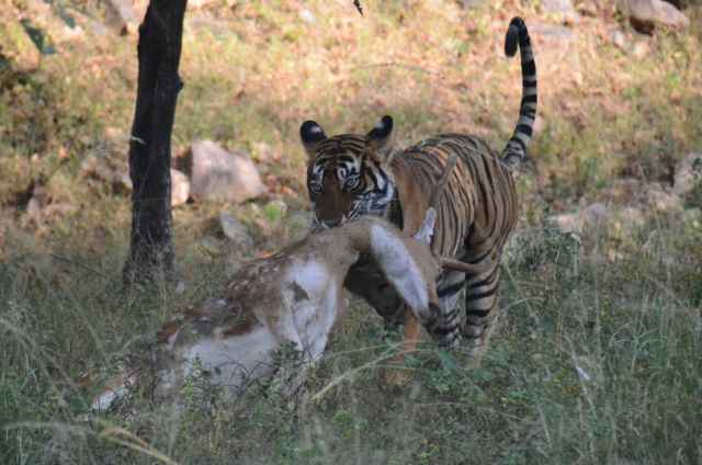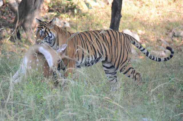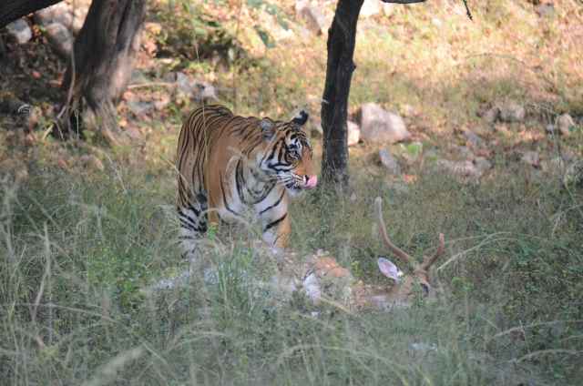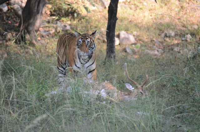 Now the thrill of the “hunt” began, our guide was on a mission to find us a Tiger. He was asking every tour car that we crossed and finally one said they had seen a Tiger sitting in some low grass a way down the track. So off we went at a fast pace, bouncing along the road until he picked the spot and within seconds we had a view of a distant Tiger (about 200m away). We took lots of pictures just in case this was the only tiger we saw while we were here, but we knew that shots over a distance weren’t going to be too good here due to the haze in the air. Our guide said that the tiger would be on the move soon, as the day was warming up and they don’t stay still for long. Sure enough it was soon up, and after “spraying” the area leapt into action towards what our guide said was a herd of deer. You could hear the deer giving out warning screams. We lost sight of the tiger in the scrub, so we cruised along the road for a while and waited for more alarm noises from the deer. We could hear them alarmed a bit further down the road so we headed off, and then our guide made the driver take us to a known trail that the tigers use, and sure enough there was our beast, a large female tiger with a deer in its jaws. We drove to within 10m of it and watched as it effortlessly picked up its catch and took it into the bush for a leasurely meal. We got some great action shots here and then moved again to try and get a better look at it feasting. Our view was shielded by the long grass it was in, but you could hear it, tearing at the carcus and crunching on the bones as it fed. An amazing experience, apparently only 20% of visitors to the park ever see a tiger, and we saw one on our first of 5 safaris, how lucky we felt. It was then time to go back for a well earned breakfast and our next Safari at 3pm.