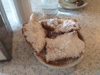 Just as we went to go back to the markets area a train went by and we had to wait. It turned out to be a VERY long freight train. So 10 to 15 minutes later we go back over the tracks and made our way to Cafe Du Monde, to try their famous Beignet, they reportedly have the best, anywhere! It is the only food they have on their menu and the place was packed, at least 100 tables, all eating these Beignets!!!