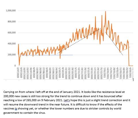 Below is an updated chart of the data in my Diary. The world was doing so well, but then something happened, the numbers stalled in their descent. Is this due to complacency because we have a /several vaccine(s), are we just getting tired of compliance, are the new variants of the virus starting to show in the numbers or is it a combination of all this, or something else. I guess time will tell.