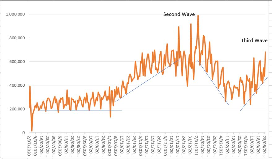 I wish I had good news on the Covid-19 front, but it looks very much like it that the world is going into a third wave of infections. The graph below says it all.