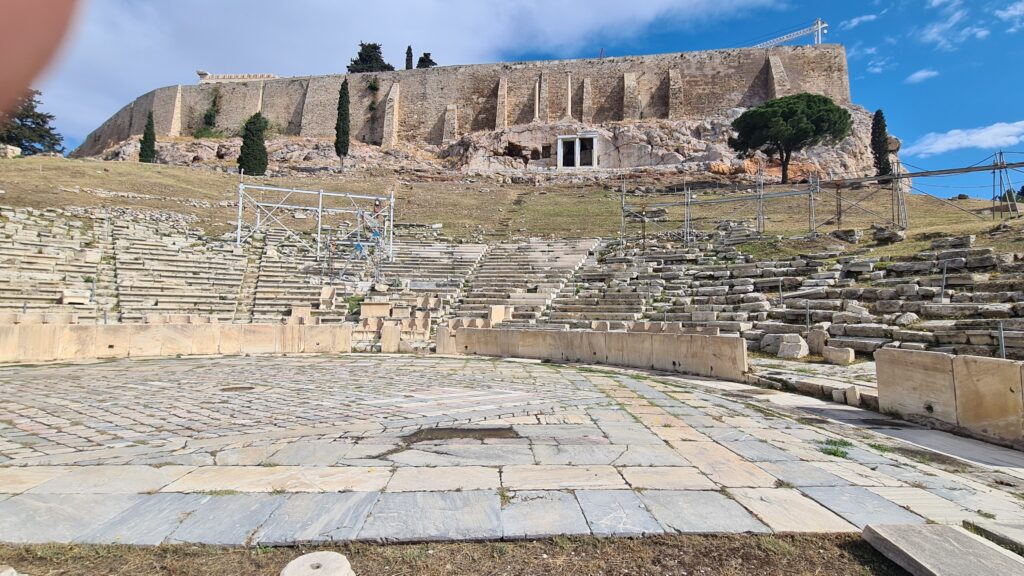 We passed by the Stoa of Eumenes, an Hellenistic colonnade that served as a refuge from the weather for theatre spectators and for storing theatre props. It is located between the The Theatre of Dionysus and the Odean of Herodes Atticus.