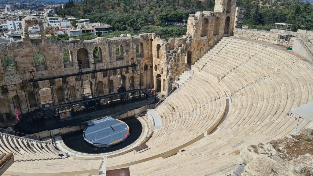 The Odean of Herodes Atticus is a stone theatre built by the Roman, completed in 161AD (and renovated in 1950) It is still used today and seats about 5000 on stone benches, hint, take a cushion! In ancient times it had a wooden roof, today it is open air.