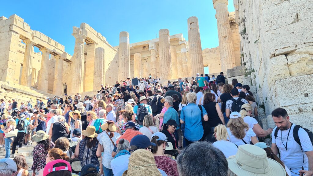 From there we climbed further to the entrance of the plateau at the top, the Propylaea. It serves as an entrance, here it was built wide enough to allow chariots through. An impressive entrance by any measure with tall columns either side of the entrance pathway, and Temple rooms either side. Did I mention how crowded it was!