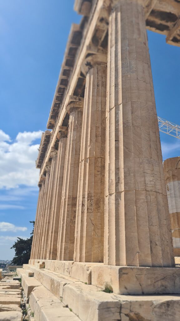 The Parthenon is an impressive structure by any measure. The Parthenon is said to have been built using the Golden Ratio (9/4). It is said that this was used to avoid visual distortions to it when viewed from a distance. Basically this means that from any perspective it’s lines always look straight. Its outside columns are huge, around 2m in diameter and 10m+ high. The Parthenon is a very impressive building that has seen the ravages of time and hostile cultures.