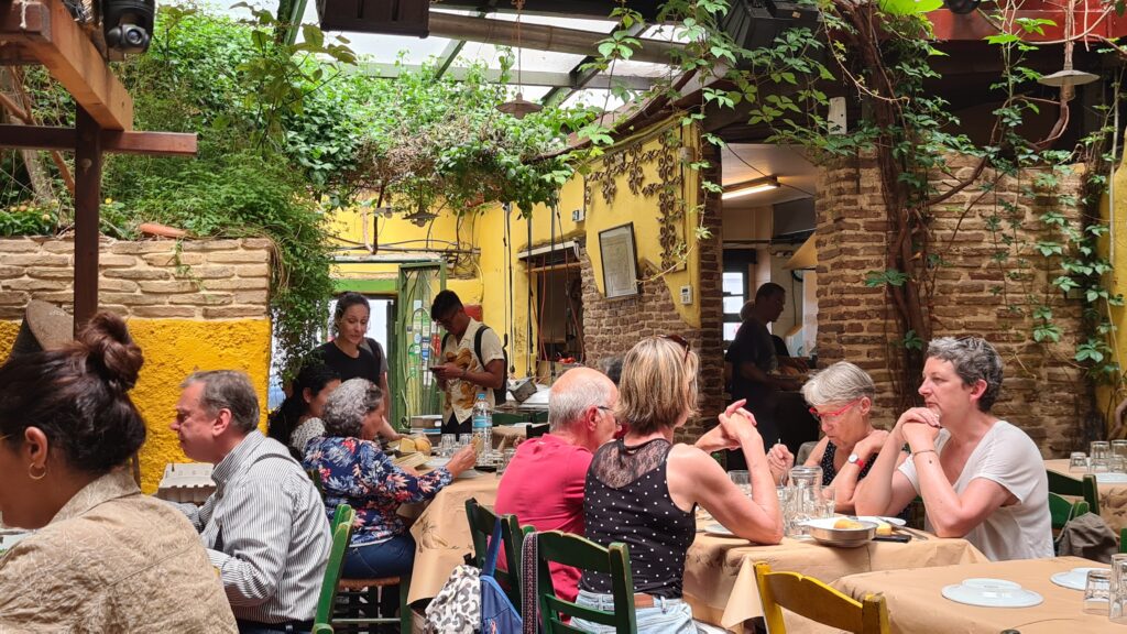 From there we walked back into Athens, and Anastasia took us to an authentic taverna, Klimataria in the Psiri area, here we had lunch. The food was rustic in appearance but full of flavour and very generous servings. As we sat down our server put some rustic bread and a dip on our table. We had a Greek Salad, (it seemed strange that it would be called that here) , a traditionally slow cooked Lamb and Potato dish and a Mussaka, I ordered a beer to go with it. ( I finished up with a 500ml handle of local lager, very tasty) We had a great time there soaking up the atmosphere, music, eating good food and relaxing.
