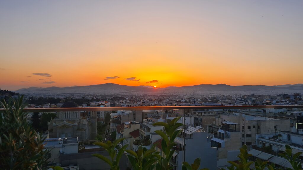 Sunset tonight was at 830.pm. We were up at the rooftop bar ready for it, in expectation of the Acropolis at sunset. The sun actually set at almost 90 degrees from the Acropolis, over the hills. It was a pretty sunset with a very orange sky and few clouds. The Acropolis got a bit of the orange tint fro the skies near it. We left before it got dark.