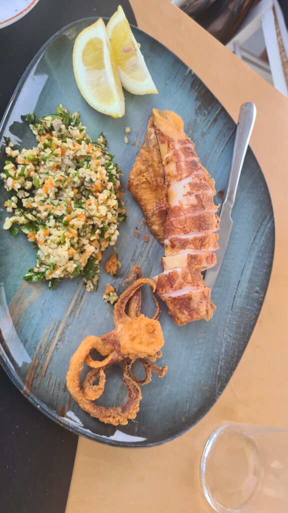 We had lunch at a restaurant called Medusa, with views overlooking the water. We shared a Greek Salad with local cheese (think cottage cheese style feta, with loads of flavour) and some chargrilled octopus. I had a local pilaster to wash it down. It was delicious, and good to say we are finally working out portion sizes and ordering just enough for us.