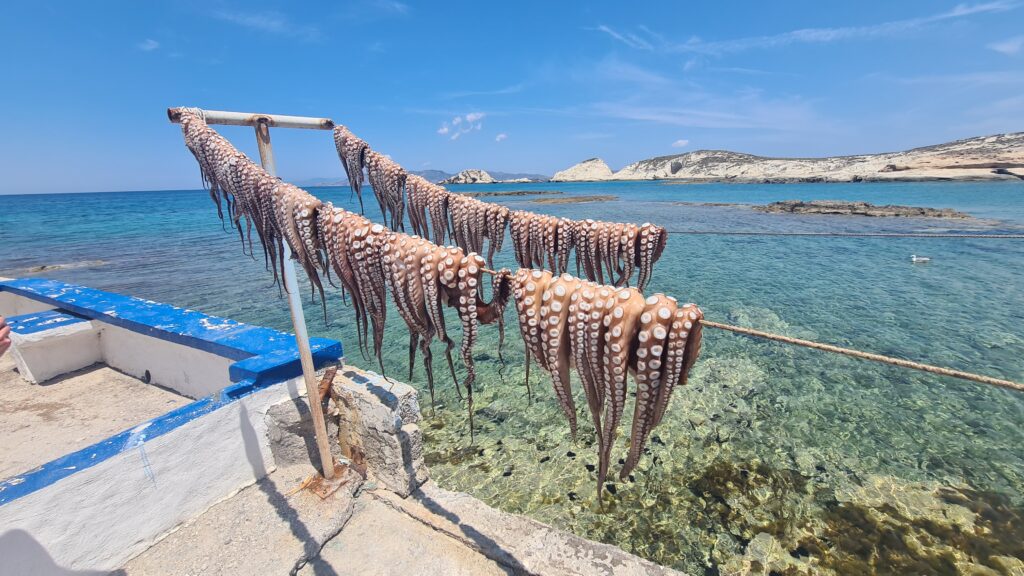 Next we drove down to the coast to a small village called Mandrakia. It has boat sheds carved into the cliffs and just a few homes right on the shore or cliffs overlooking it. Another beautiful village. Walking around we found a spot where a fisherman had their catch of octopus hung on lines in the sun, presumably drying. Fascinating!!