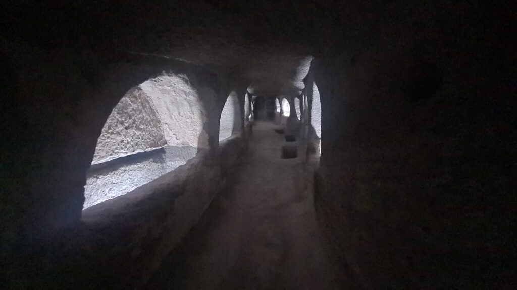 We the went to the nearby catacombs. They had been called The Greek Caves by the locals who were decended from Cretan settlers. The catacombs had suffered extensive damage over the years until they were rediscovered in 1844 by Ludwig Ross and further investigated and preserved by French archaeologists in 1878. In the entrance there is the remain of a large chamber, that once housed someone very important, it was later used as a type of alter. There are three chambers open, but you can only go into two of them. All the remains have been removed to another location (reburied), so all that is here now is rows of empty burial chambers.