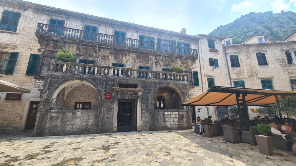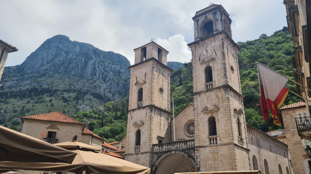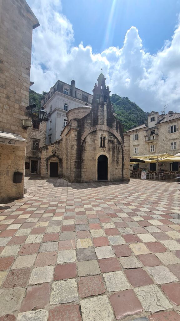 The walls of the town are 4.5km long and up to 20m high, an imposing structure. The walls were commenced construction over 1000 years ago. The walls once used to go up into the mountains behind the city, you can still see some remnants today. The Old Town once had 30 churches within its walls, the largest of which was funded by the community, many smaller churches were built by the wealthy of the time. The Cathedral in the Town is the largest in Montenegro, and is named after the patron saint of the town, Saint Tryphon. There are also a chapel and a church built on the mountain slope and top of the mountains behind the city. The mountains are called the Saint Giovanni Mountains. These are often visited on special days. There are about 450 steps to the chapel and almost 1400 steps to the church. The Old Town had approximately 300 buildings within it and a medieval population of 4 to 5,000. Now during the winter it has appellation of 400.