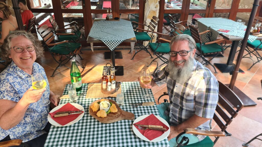 He was the most charming and entertaining we have had in a very long time. Almost as we sat down he was offering us Cherry Grappa. (everyone gets this), it was very fruity in flavour. We had ordered the Jadranska hobotnica peka (porcija) – or Adriatic octopus baked under the iron bell, for those not fluent in Croatian. We though we had ordered one serve between us, it had to be ordered at least 3 hours in advance, but no our hotel had ordered one serve each, that’s one octopus each! So glad we hadn’t had much for lunch. We were undecided about what wine to have with it, so Zdravko brought out a generous tasting of each of the two wines he said went well with the octopus. We settled on the Chardonnay. Then I was given another Grappa! Next he brought out an appetizer for us, doughnuts and creamed (cows) cheese. They were delicious, the cheese was salty.