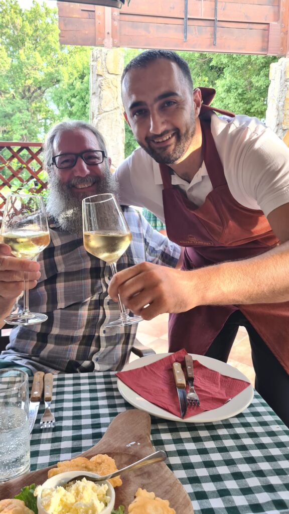 We left for dinner at about 5:15pm by Uber, (the Ubers are so inexpensive here compared to same journeys at home), and headed for the hills and Konoba Dubrava. Our driver explained that the weather in Croatia comes mainly from Italy, mostly from the SW. The road to the restaurant, once we left the main road, was essentially a one way lane, with occasional passing bays. Patience was required on both trips up and down.