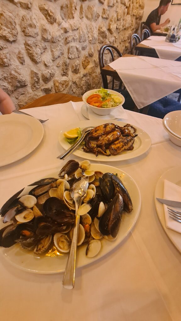 we shared grilled squid, a plate of muscles and clams in white wine and garlic, and a simple salad. While the squid and clams all tasted great, the only thing that wasn’t over cooked and rubbery was the muscles, disappointing. The restaurant had great reviews.