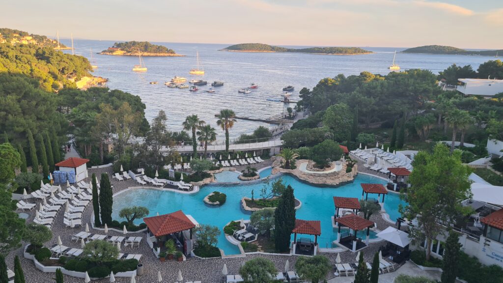 The ride was about 80mins and we landed in Hvar Harbour at 2:20pm. We were meant to be picked up, but there was no one there. We saw a transfer guy from our hotel, he didn’t speak English, but luckily someone else from the hotel who spoke English was there. He directed us to the taxi area around past the Cathedral, a good walk from where we were, thankfully they took our luggage. We eventually found our ride, he was very apologetic, saying he was a late call after the first driver never showed up. We arrived at our hotel around 2.45pm and checked in. Our room has a balcony and obscured sea view (half the view is blocked by another part of the hotel!). The room is on the small side of things. But it has a good sized window!