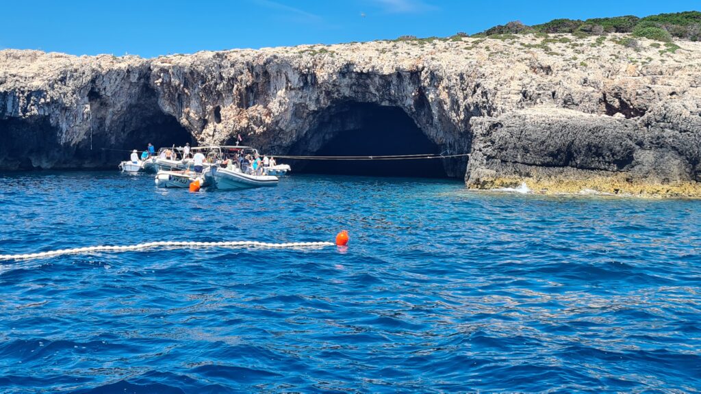 A tour boat coming out of the Blue Cave, a tight fit