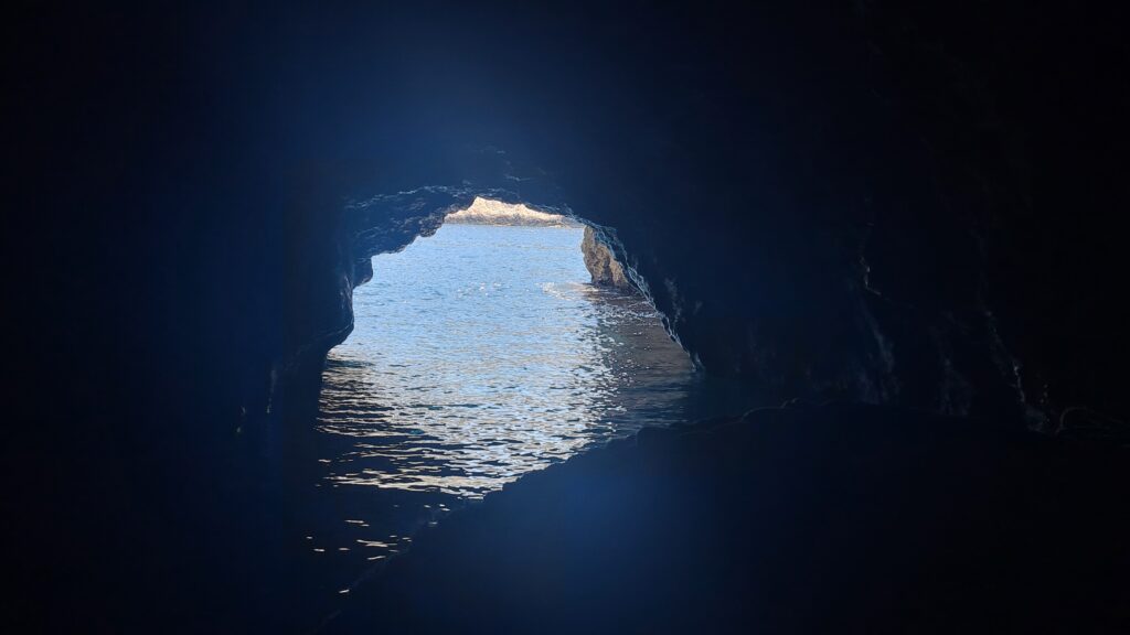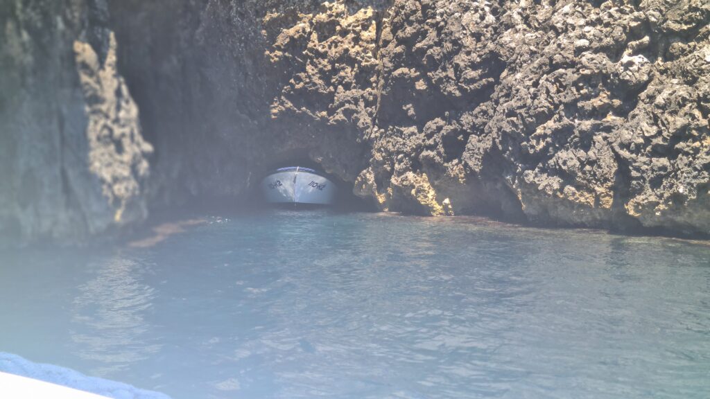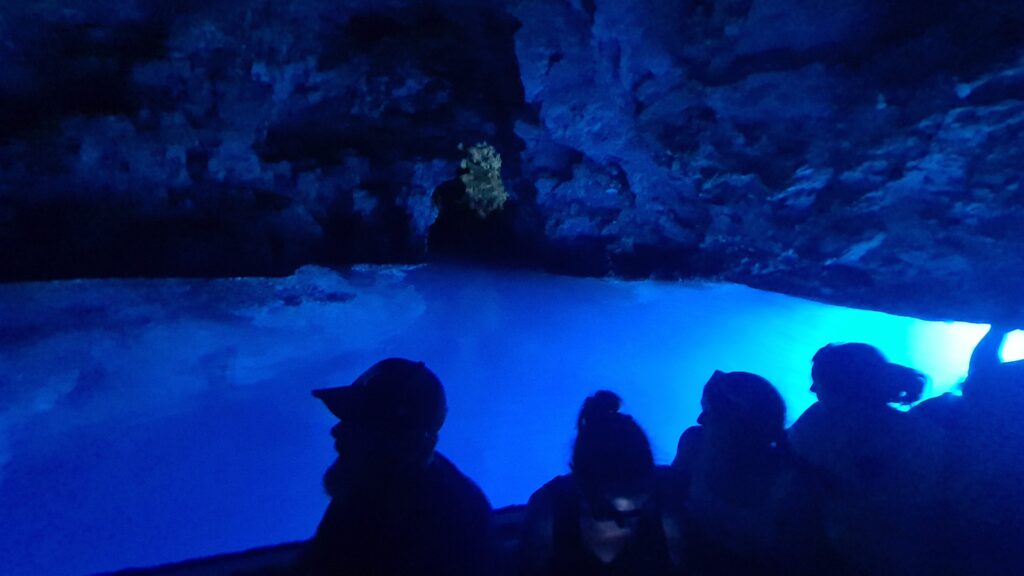 At around 1:10pm we pulled into the wharf for the Blue Cave. The Blue Cave is heritage and UNESCO listed, so you aren’t allowed to swim in it. To get there you need to go by small guided tour boats. There is a small kiosk where you buy tickets (and souvenirs). At peak season the queue for tickets and the boats can get as long as 4hrs! We had our tickets in 5 minutes and were on a tour boat in 15 minutes. The tour was fun. You start off with a short ride around a point after crossing over a shallow rock shelf in a narrow passage between the insland and a rocky outcrop. The entrance to the cave was blasted into the cave wall in the late 1800’s. The entrance is maybe 3m wide by just over a metre high, we had to duck as we entered.