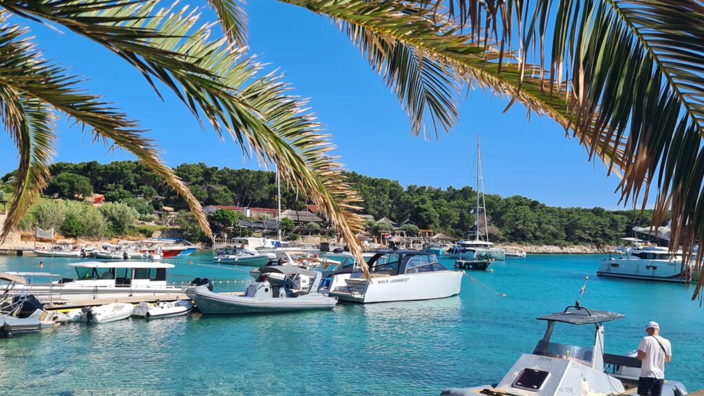 Our next stop was lunch at a restaurant on Palmizana Island. Our group had a good laugh try to pronounce that name, all of us finished up sooner or later with Parmigiano. The restaurant perched at the end of a bay with views over the water was called Bucchus Palmizana Hvar. Deb ordered Grilled Squid and I got Tagliatelle with shrimp (way too small to be called prawns) with a mixed salad to share. While both meals were tasty, we were disappointed with the seafood again, it was over cooked. After lunch we sat in a shady area at the end of the beach under a palm for an hr watching the comings and goings around the wharfs.