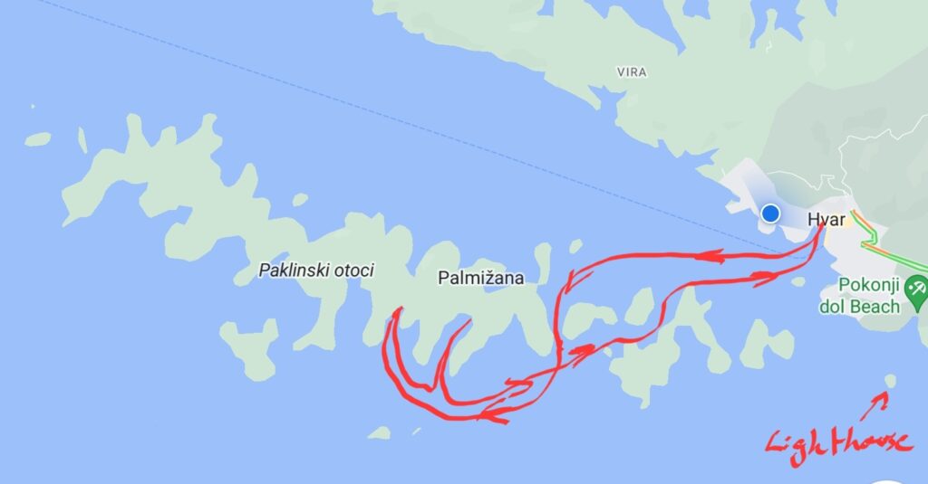 We set out at 10am under motor, there wasn’t really any wind. As we got out of Hvar Harbour Rocco pointed out a small island to our left, it was a rocky outcrop with a lighthouse on it, this was the most eastern of the Pakleni Islands.