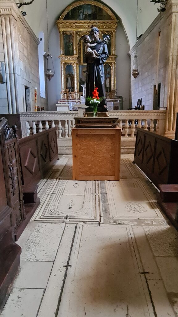 We went into the church, a single-knave Gothic style. It felt old, the floors we made of tombstones of people buried beneath us. The church was divided in to two main “rooms” and a couple of small chapels to one side. The main room had an alter and a statue, and to the sides dark wooden seats for either the chorus or prominent people, hard to tell. The back room look like it was for the common people, fairly plain with rows of benches facing the alter.