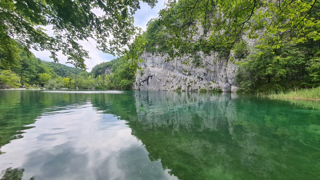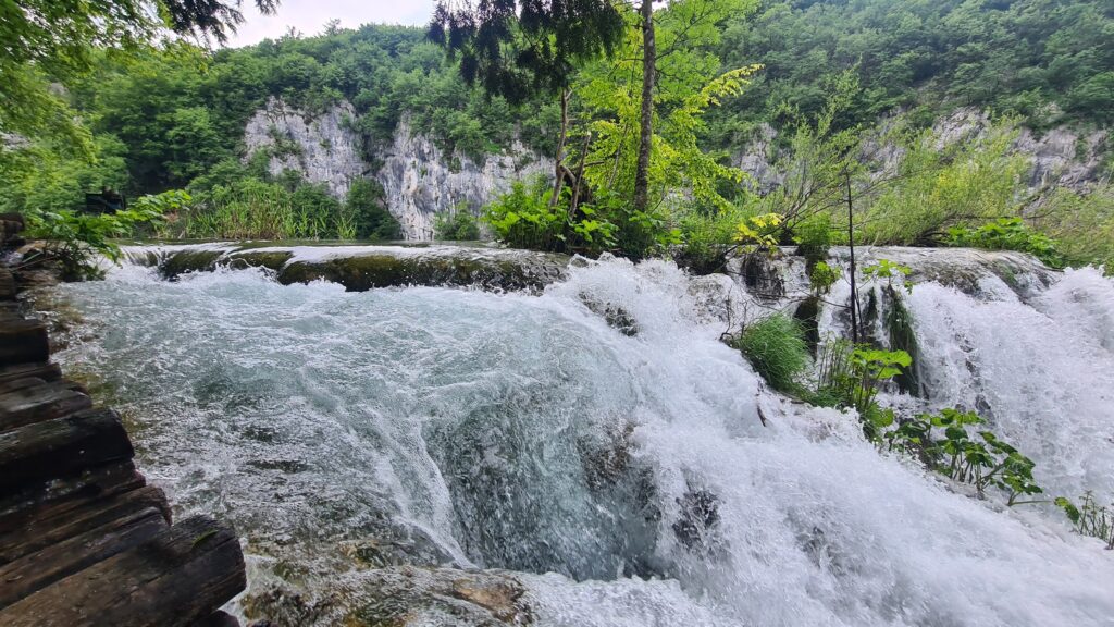 We had a good time walking along the edges of the lower lakes. All the boardwalks here, and that is a lot because almost everything you walk on near the falls or the lakes is a wooden boardwalk, appear to be made from local timber, they look great. There are so many waterfalls. The lakes are at the bottom of a deep valley, and the terrain steps down as it descends into the valley. New lakes are formed at each step and the waterfalls form between the steps as the water drops from one lake to the next. The bigger the drop between the lakes the more spectacular the waterfalls. Most of the waterfalls traverse the full width of the valley, maybe 100 to 150m wide. The biggest waterfall is at the lower end of the Lower Lakes, Veliki Slap (Slap is Waterfall in Croatian), it is a 78m drop. This waterfall, unlike the others in the system, is formed when a stream, the Potok Plitvice, cascades down from the top of the cliffs, not from the lakes upstream from it. The drop occurs in two stages. It’s impressive and be prepared to get wet if you want to view it from up close at the bottom. After there we made our way up the valley on boardwalks. The waterfalls in order as we saw them were; Veliki Slap, Sastavci, Novakovica Brod – a cascade about 12m high down a series of steps between lakes, Kaluderovac, Gavanovac – a cascade down about 6m high, at the top where the water leaves the lake it is like the edge of an infinity pool, spectacular to watch, Milanovacki Slap – a beautiful set of falls bursting out from a tree lined edge, and Stapovi Mike Trnine – a dramatic surge of water from a large lake, the falls aren’t as steep as others and reminded me of a mean set of rapids. ( This is the best I can do in identifying each waterfall, signage is almost non-existent here and Google isn’t much help either – so please excuse any errors).