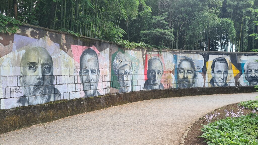 I will let you workout what it looked like (the pic might give it away as much as the name), it was called “Maiden with the Seagull”. A bit further around we came to The Open Air Theatre. The wall out the front of the theatre had murals of great people in the arts and sciences from around the world.