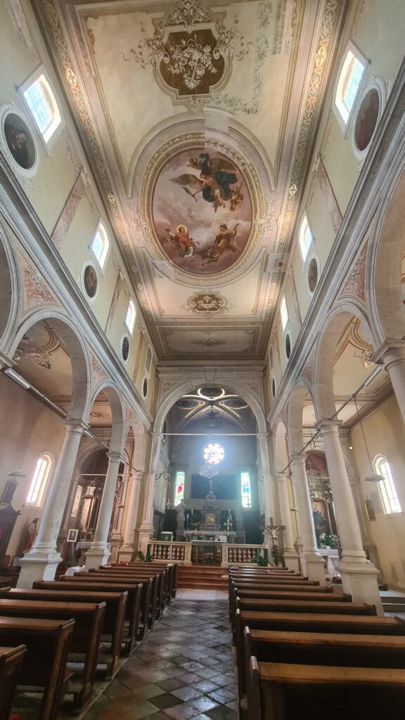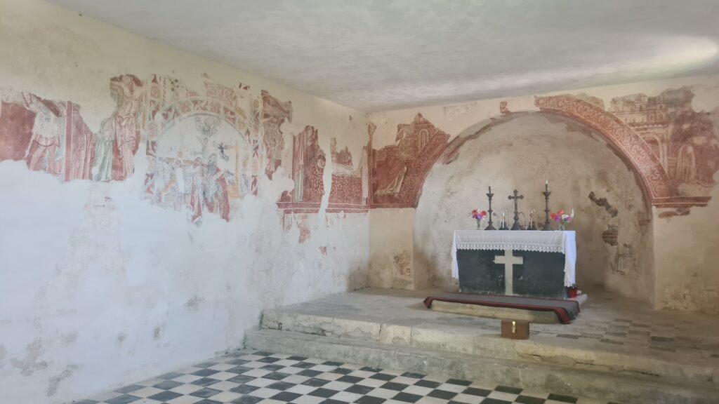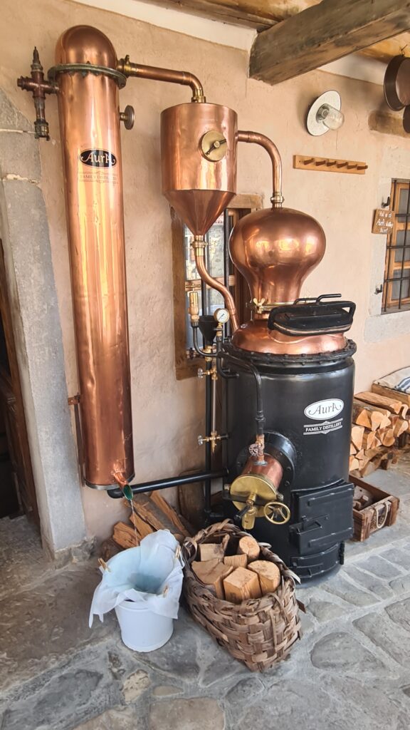 The City/town comprised of 8 to 10 buildings inside an enclosing wall. The City /town has a pop of 28. It was an interesting little town., with a deviated main entrance into the town, and defensive windows and devices at the entrance. There was an old church inside, St Mary’s of Assumption, a Baroque church built in 1802 on the site on an earlier 13th century church, as well as a few shops, a museum, and some residences. We saw at least three operating stills in the town,