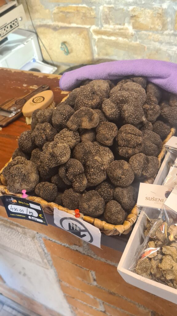 From there we went to Motovun, the Truffle capital of Istria. It is perched high up on a hill, and has very narrow cobblestone roads. Only residents cars are allowed in the town, so we parked outside and walked up the hill to the top of the town. Black truffles are hunted in March to November, and White Truffles are hunted in October to December. They use mixed breed dogs to hunt for Truffles because they are easier to wrangle than the pigs the French use.