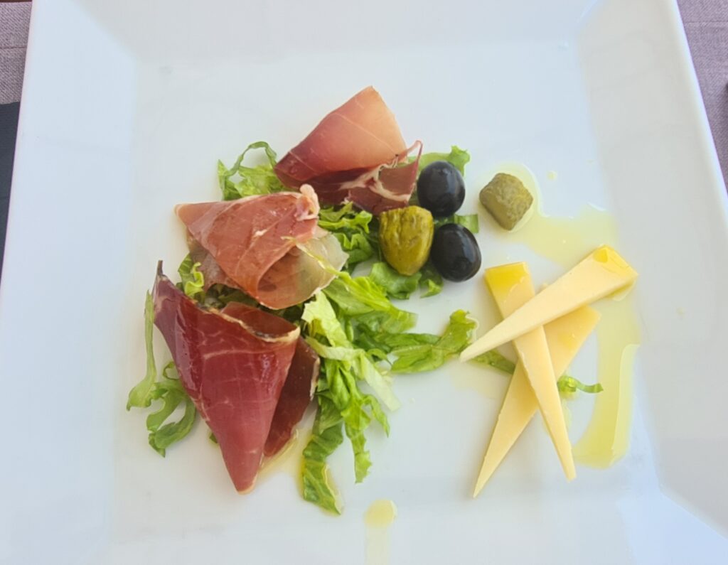 We then went for lunch. The restaurant was owned by a local winery, Fakin Wines. We had a wine tasting that was accompanied by our lunch. We started with a plate of prosciutto, cheese, olive and gherkin,