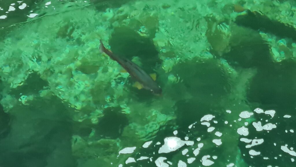 We saw a large trout swimming in one of the calmer stretches of water.