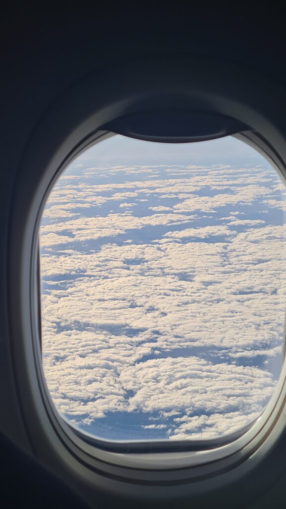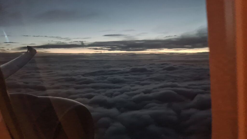 It was a long flight, at about 35,000 ft or 10.6km up, I guess we got about 4hrs sleep on the 2nd flight and a few on the 1st. (6hrs over a 55 hr period!!)