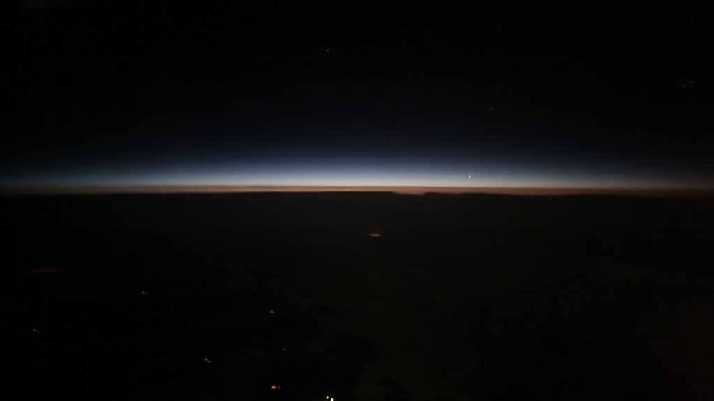 and then later in the flight I woke from a few hours sleep to see the moon out of the very top of one of my windows. As Deb pointed out earlier in our flight, I have 3 windows, she has none! What’s with that, I did offer to swap seats but she declined. I also saw a couple of planes going the other way (well, their navigation lights).