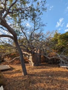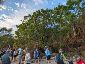 From there, we set out on a 1.6km walk through some rocky basalt countryside and dry monsoon creeks. It was a short walk to the, “Mermaid “ Boab tree. The tree is surrounded by a raised steel platform, to protect the root system from trampling and foreign diseases. From there we walked along some bush paths that circled back to the beach.