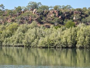 In the afternoon, around 2:15pm, we set out on a cruise up the Prince Regent River on an Explorer up to King Cascade (Mambulbada) The river is situated on a geological split that has resulted in it being almost perfectly straight for about 30kms. Our Explorer went at about 30Knots/hr for 1st half of the trip up there (20mins), and then we paused for a small pod of Snubfin dolphins (5-6). This species has only been classified in the last 6 years. They are small, very shy and hard to photograph. The river is lined with mangrove, and occasionally the mangrove green is broken by orange coloured trees in mangroves, these were Cedar mangrove trees.