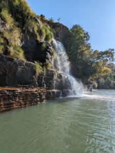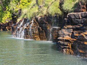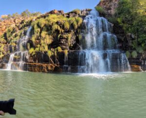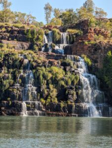 We were soon at the entrance to the Cascade. A small inlet to the river, opened up into a large “pond” with a cliff on the southern side, the cascades. There were 3 main Cascade waterfalls, with a few more in between them and outside them. It was beautiful. The water of the cascades is fed by springs. Water that had accumulated over the wet season and then comes back out in the dry. It sort of sparkled. We both had a turn of having, a Kimberly Shower, off the front of the Explorer. It was very refreshing, standing under the waterfall.