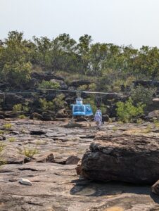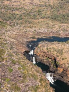 The chopper went at up to 150km/hr on the way there. On the way up we circled a couple of crocodiles resting in the the middle of the Mitchell River. We soon arrived at the Falls and the pilot did a couple of loops so everyone could see the them from both sides of the helicopter, and get some nice photos.