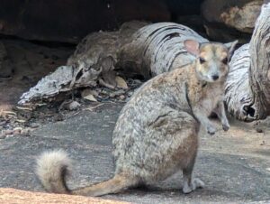 We landed and made our way to a covered area. When we got there, there was a Monjon (the smallest species of rock wallabies, scurrying around.Monjo