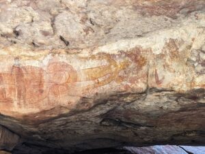 Many of them over drawn once or more times. There were drawings of the Wandjina, cloud and rain spirits of the local clans. The Wandjina depicted had large “halos” around their heads, with large upper bodies and their heads had eyes and a nose but no mouth. The were at least 3 or 4 Wandjina drawn here, all were very long compared to the other Art. I loved these images, for me they were multi- dimensional and alive. I wished they could speak and tell me their stories.