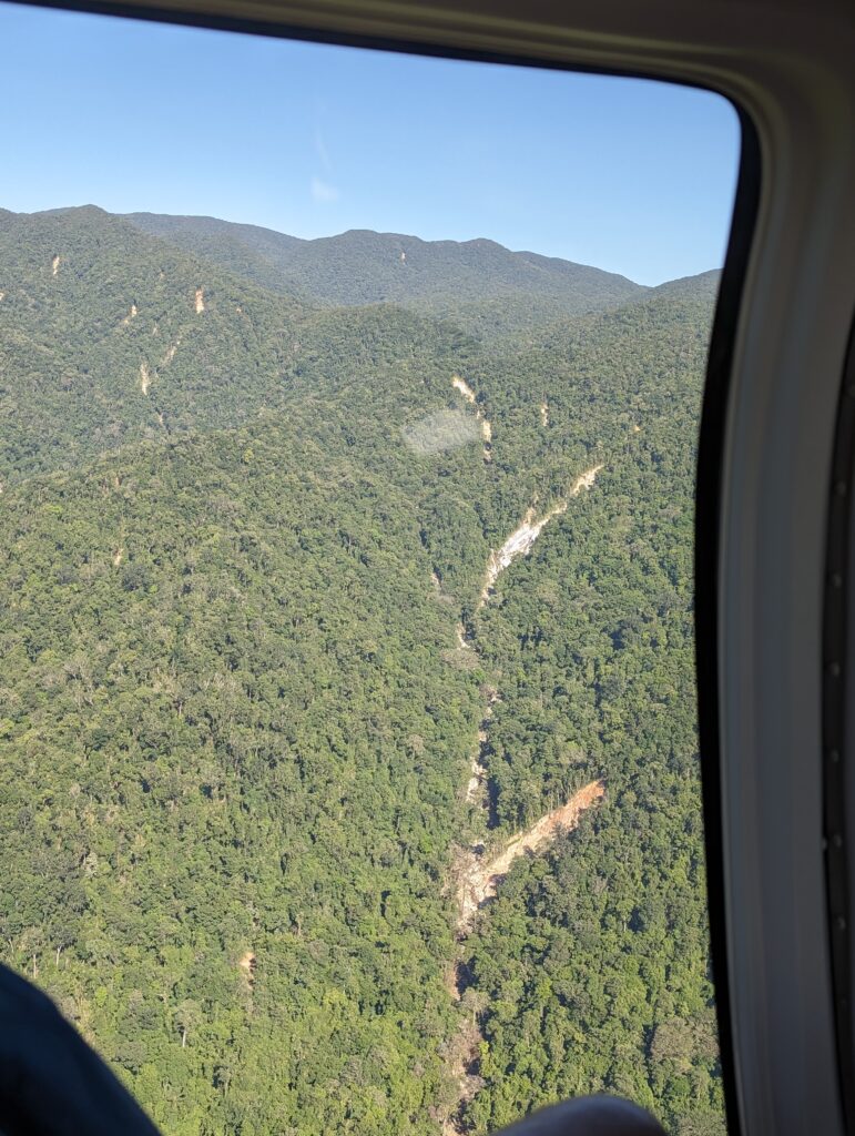 Cyclone Jasper, went through this area late last year had devastating effect. Before there was only 1 landslide visible in the hinterland, now there are 100’s.