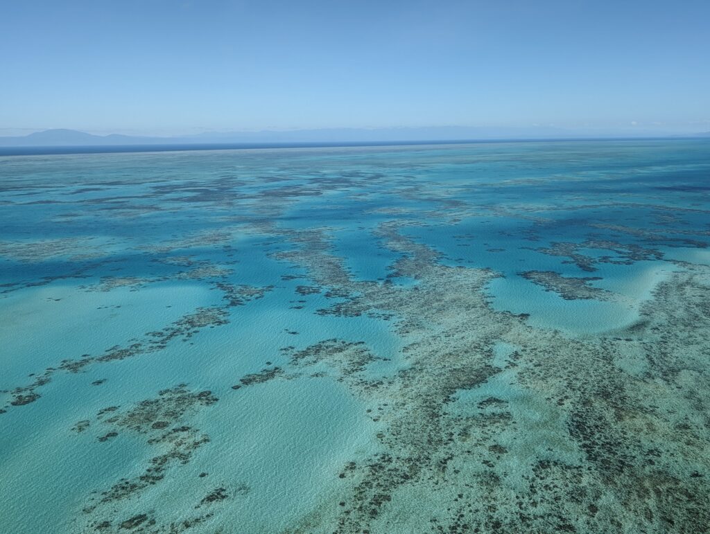 And then it was out over the seas and towards the Great Barrier Reef, a small portion of its 2300km length. We were told that the reef supports 10% of worlds fish population. As we flew over it, the water was about 1.5m deep on reef at this tide and descended to about 30m just away from it, and to around 2km+ deep at Continental shelf some 10km further out.