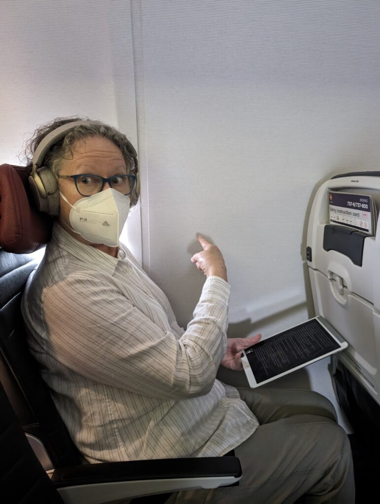 We did well again. No one in the seat between us. That makes for a comfortable economy flight. While Deb had a window seat, we some how managed again for her to get the “windowless” window seat!!