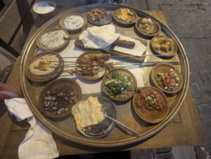 Deb found a little place, we think it was family run, not far from us, Bilice Kebap. It is located on a busy narrow street, full of small restaurants, bars and all sorts of humanity. We got a table outside and while we were waiting we had visit from a bearded guy in a wheelchair, he had 3 colourful parrots sitting on his shoulders, and his beard was coloured yellow and blue to match one of them. We had Beef Kebap and Chicken Skewers for 2. It was a feast. First came out a 1m+ round tray with 10 different accompaniments around its circumference, followed shortly later by a 20cm beef kebap hidden under the softest flatbread you could ever eat, and then about a dozen chicken skewers. Everything was so fresh and tasty. Deb had an Ayran, a yoghurt drink to go with it (the healthy option), I had a coke. The meal was finished off with a glass of hot tea each and some freshly cut watermelon. It was the most fabulous meal, the family were all so welcoming, the food delicious and the atmosphere on the street was delightfully memorable.
