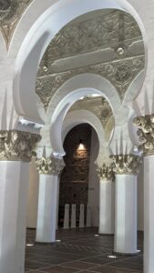We walked from there into the old Jewish section of the city and onto an old Synagogue. Along the way we saw small blue tiles fixed to the pavement and at ground level on buildings, they depicted a “menorah” and are used to define the “boarders” of the Jewish area. We went into an old Synagogue, it is now a museum, but it was in its last use a Christian Church. It was built by Arabian builders and so has numerous Arabic/Islamic symbols and architecture built into it.