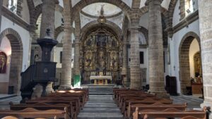 I took the Ingress way along the coast to the Old Cathedral, zigzagging around the streets, nothing like a straight line walk. I got to see more of the old town, much of it devoid of people. It was so nice walking down empty streets, it was after all, siesta time. I walked passed the fresh food market (it was closed) and the flower square, and many familiar streets and squares we visited yesterday. I eventually emerged next to an old carousel in the square in front of the New Cathedral, so I walked across the square, through the old gate and down the street. And there it was, on my right, the Old Cathedral. It’s a very unpretentious building from the outside, a simple whitewashed rectangle sided building.