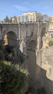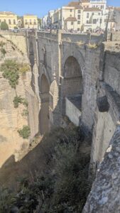 We got to the bottom of the hill and Ronda’s most famous attraction, yes “that” bridge, the Puente Nuevo. The bridge spans the gorge between the two sides of town and sits about 100m above the bottom of the gorge. It was tourist central, with people everywhere taking advantage of every possible vantage point. We got photos from all the angles (except from a distance).
