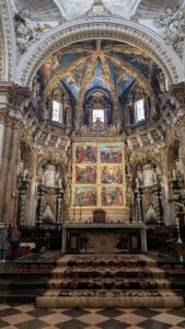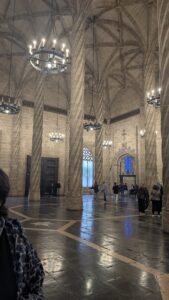 The Cathedral was build on the site of a mosque that was built on the site of an ancient roman temple. While the Cathedral is essentially a gothic styled building, because it took over 700 years to be completed, it also has elements of many other styles, such as Romanesque and Baroque. The main building is definitely Gothic, but the alter area is unmistakably Baroque, with all its lavish decoration and extensive use of gold finishes. Behind the main alter is stored, on display, a relic of St Vincent. They have part of his right arm on display, it looks mummified. In the Chapel of the Holy Chalice (Capilla del Santo Caliz) they have The Holy Chalice (Holy Grail) – a dark agate cup mounted on a gold base with handles – it is believed by many to be the cup used at the last supper! (I couldn’t see it, but here is a picture of the Chapel, see if you can find it). There are 20 chapels in the Cathedral, all of which look to be actively used. There were lots of tourists inside the Cathedral, so there was no chance of getting a feel for the space.