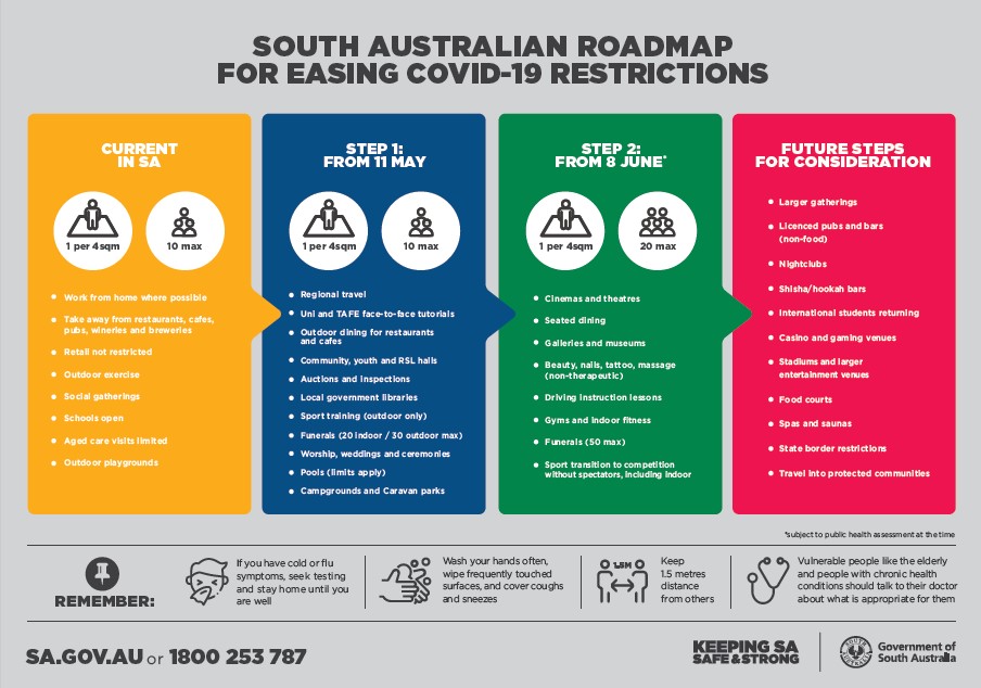 In SA this means Pubs, cinemas, places of worship, beauty salons and other sites will now be permitted to have 20 people per room, up to a maximum of 80, on their premises as long as they comply with appropriate safeguards. People will also be allowed to consume alcohol at pubs and bars without a meal as long as they are seated.