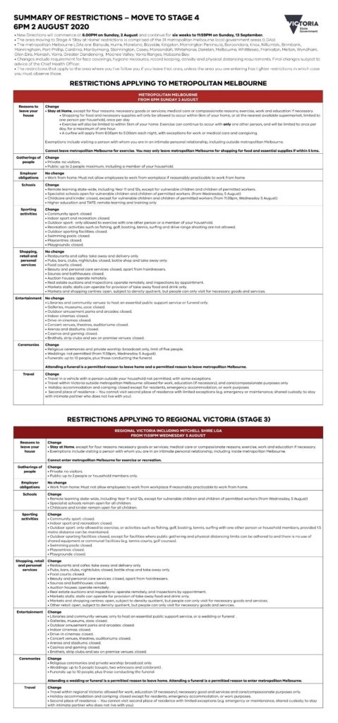 In Victoria they have introduced Stage 4 restrictions in Greater Melbourne and stage 3 restrictions in country Victoria